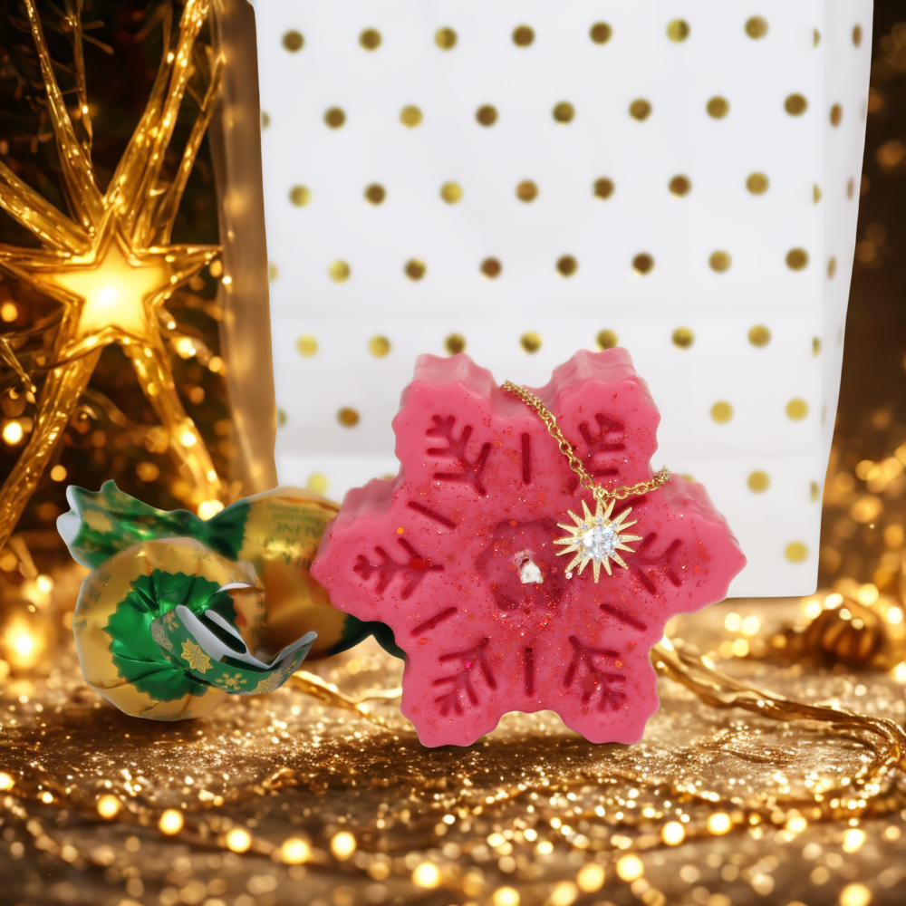 Kalėdinis dovanų rinkinys su elegantišku įpakavimu, rankų darbo muilu, papuošalu ir saldumynais – prabangi dovana moterims, puikiai tinkanti Kalėdoms, šventėms ir ypatingoms progoms.