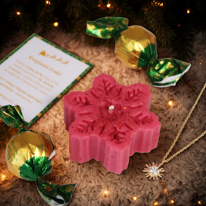 Dovanų rinkinys „RAUDONOJI SNAIGĖ“ – tai Kalėdų stebuklas, kuris tarsi nukelia į vaikystės laikus, kai laukdavome Kalėdų senelio ir stebuklingos dovanėlės po eglute. Šį ypatingą rinkinį sudaro šokoladiniai saldainiai ir nuostabaus kvapo rankų darbo žvakė. Raudonos spalvos, snaigės formos žvakė dekoruota žėručiais, skleidžia jaukų kalėdinį aromatą, primenantį eglutę, židinį ir šventinę atmosferą.