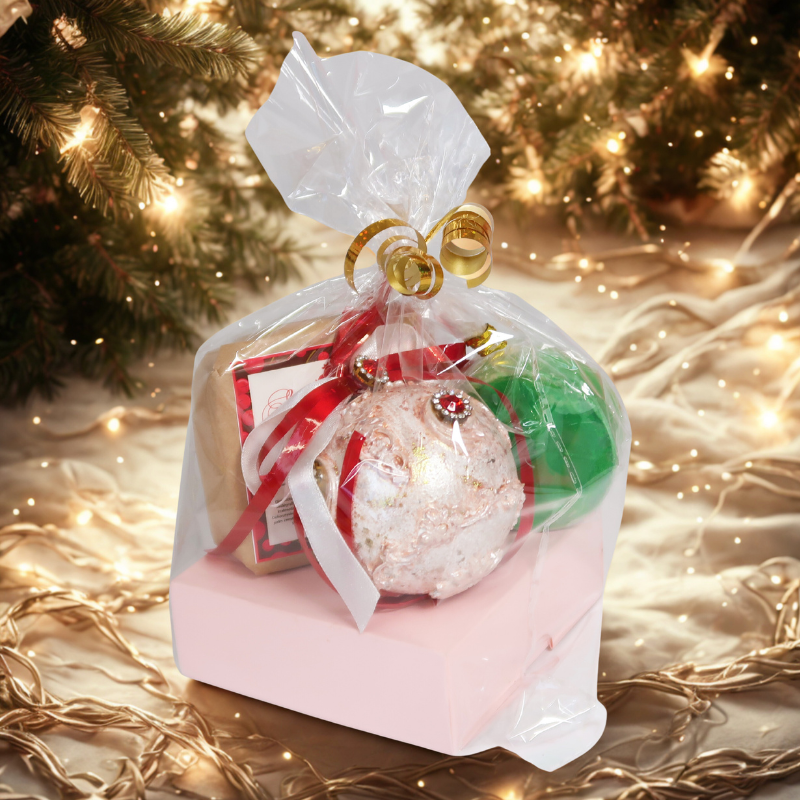Rankų darbo kalėdinės dovanos ir prabangūs dovanų rinkiniai – šventinė dovana su žvake, saldainiais ir dekoratyviniais elementais, puikiai tinkanti Kalėdoms, dovanų idėjoms ir šventinės nuotaikos kūrimui namuose.