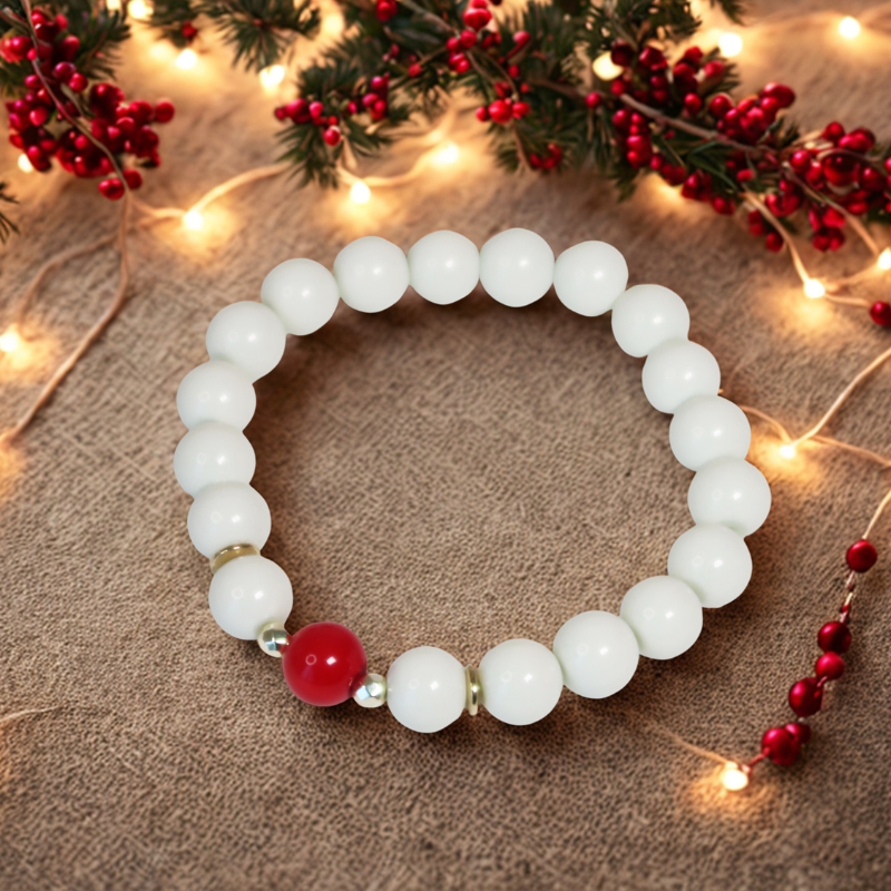 • Rankų darbo apyrankė – subtili ir elegantiška, pagaminta iš baltų karoliukų bei dekoruota raudonu karoliuku, primenančiu spanguolę. Apyrankė papildyta aukso spalvos hematito detalėmis.