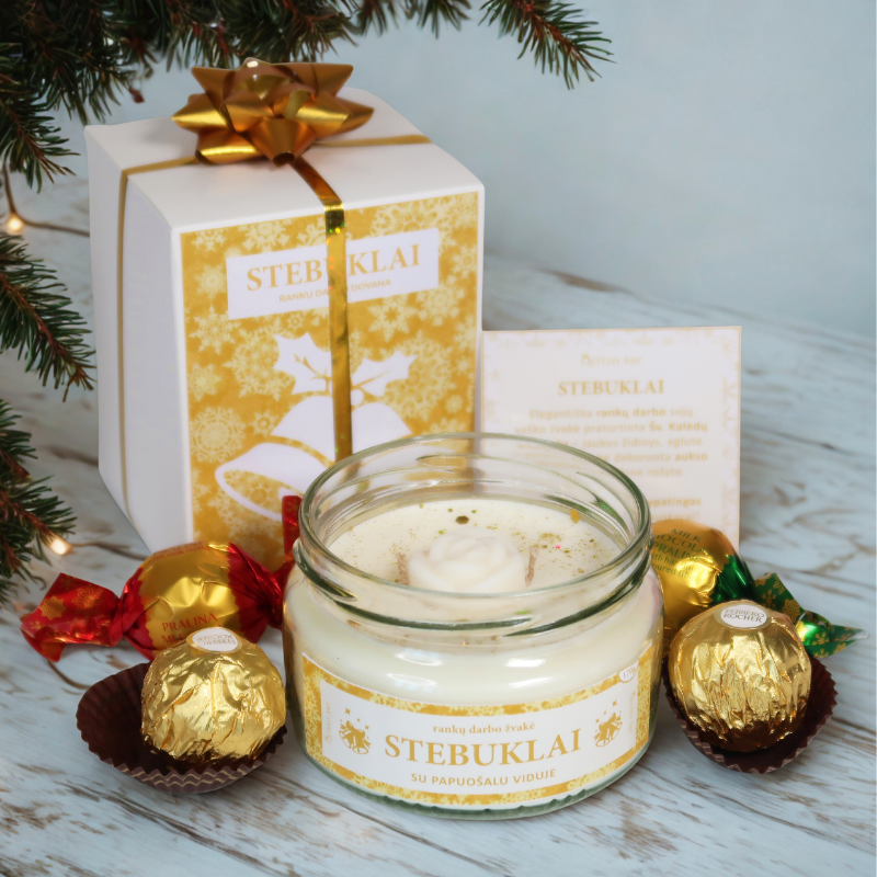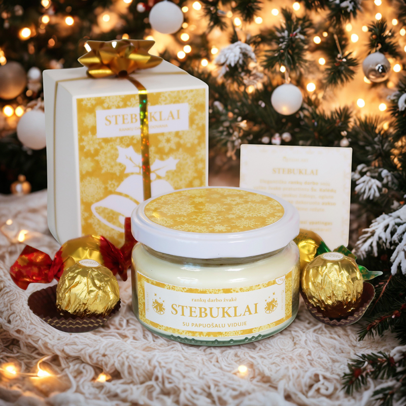 Rankų darbo kalėdinės dovanos ir prabangūs dovanų rinkiniai – šventinė dovana su žvake, saldainiais ir dekoratyviniais elementais, puikiai tinkanti Kalėdoms, dovanų idėjoms ir šventinės nuotaikos kūrimui namuose.