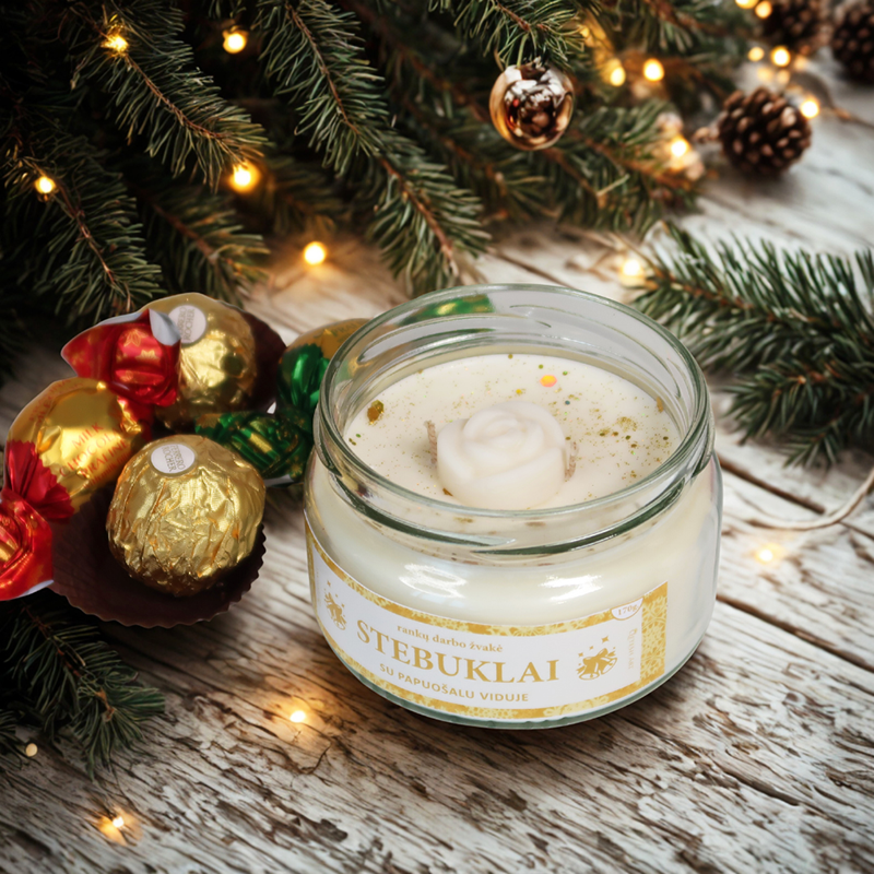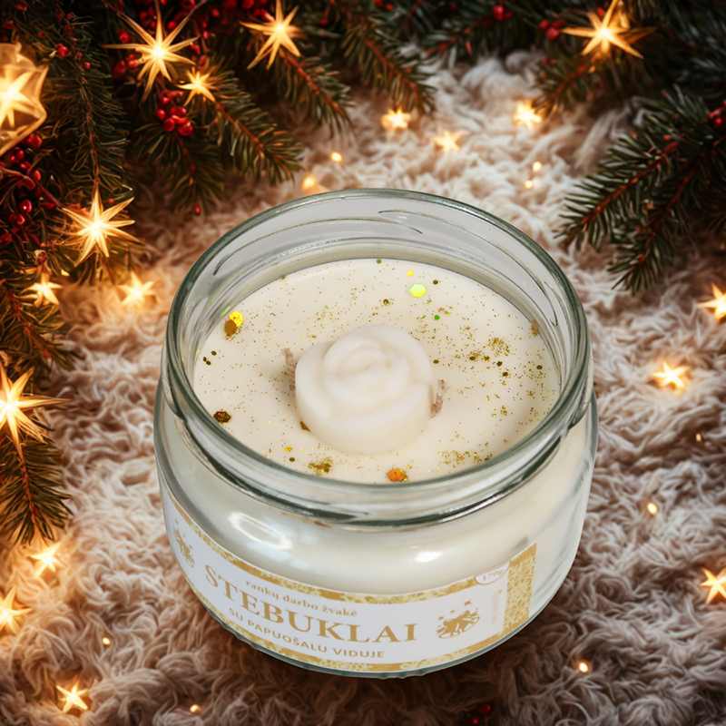 • Kvepianti rankų darbo žvakė – pagaminta iš sojų vaško, dekoruota aukso spalvos žėručiais ir vaško rožyte. Šventinis aromatas sujungia židinio šilumą, eglutės gaivumą ir gintaro natas, sukurdami jaukią Kalėdų atmosferą. Viduje slepiasi elegantiški rankų darbo auskarai – kiekviena žvakė gali turėti atsitiktinį auskarų dizainą. Papuošalas žvakės viduje supakuotas specialia folija, užtikrinančia jo apsaugą.
