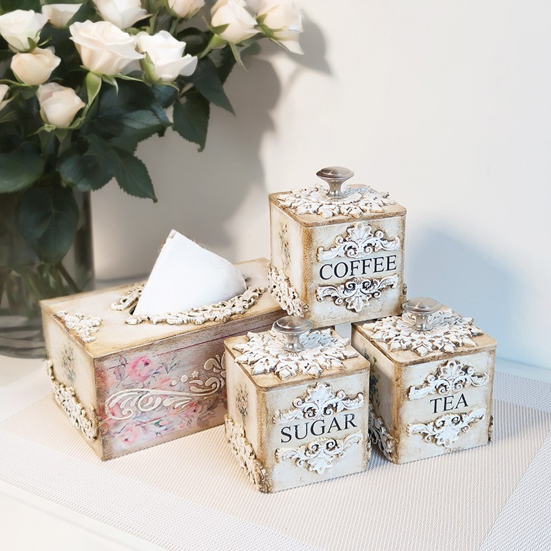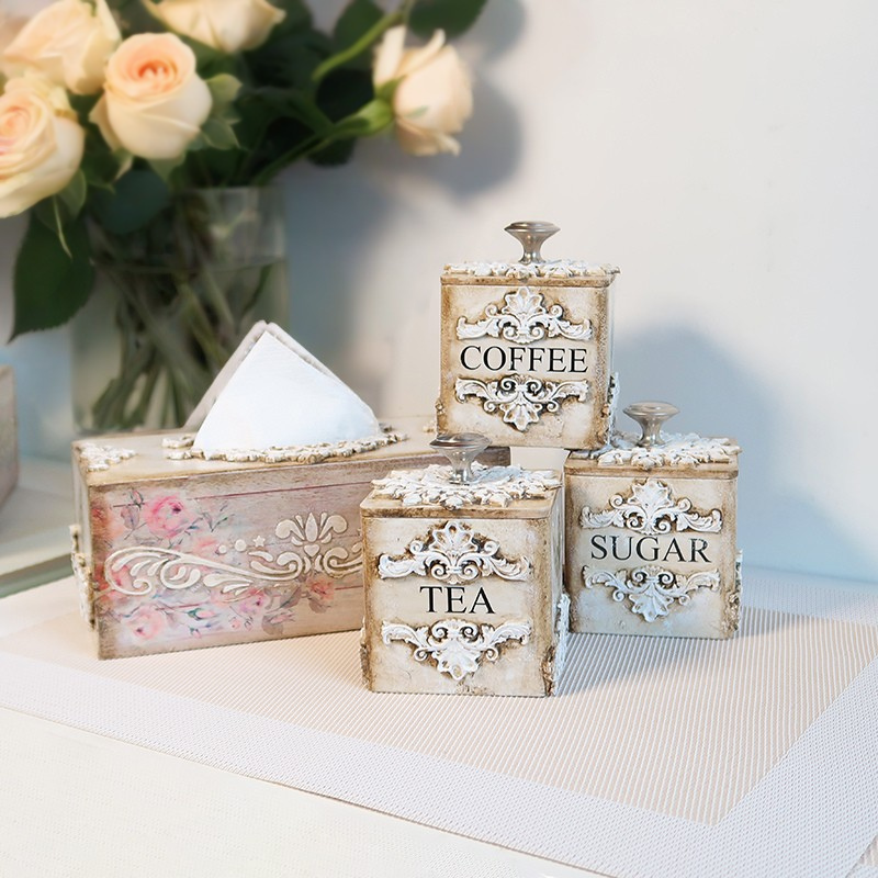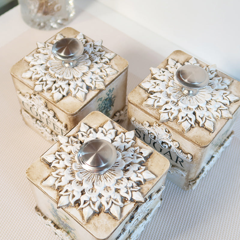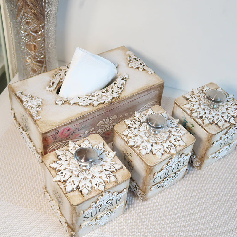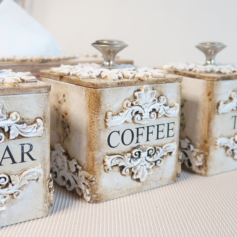 Prabangus sendintų indelių rinkinys kavai, arbatai ir cukrui su derančia servetėlių dėžute. Kiekvienas indelis dekoruotas išskirtiniais ornamentais: viena pusė puošta dekoratyviniais raštais, kitos – subtiliomis pakalnučių ir ramunėlių iliustracijomis. Rankų darbo indeliai padengti aukštos kokybės laku, todėl yra atsparūs aplinkos poveikiui, lengvai prižiūrimi ir ilgaamžiai.