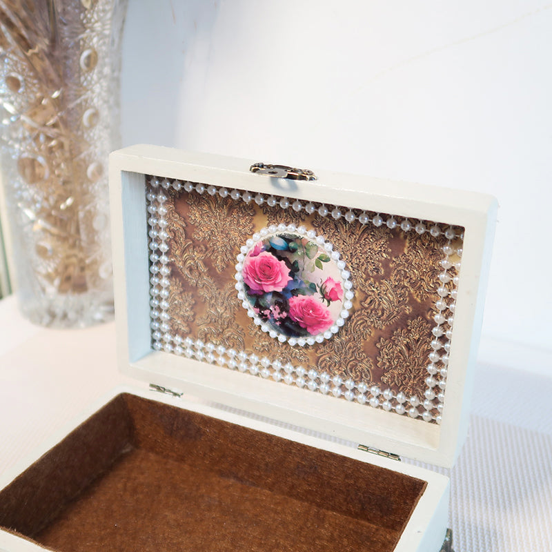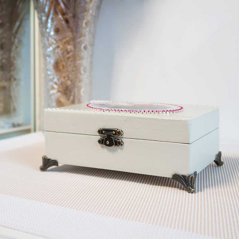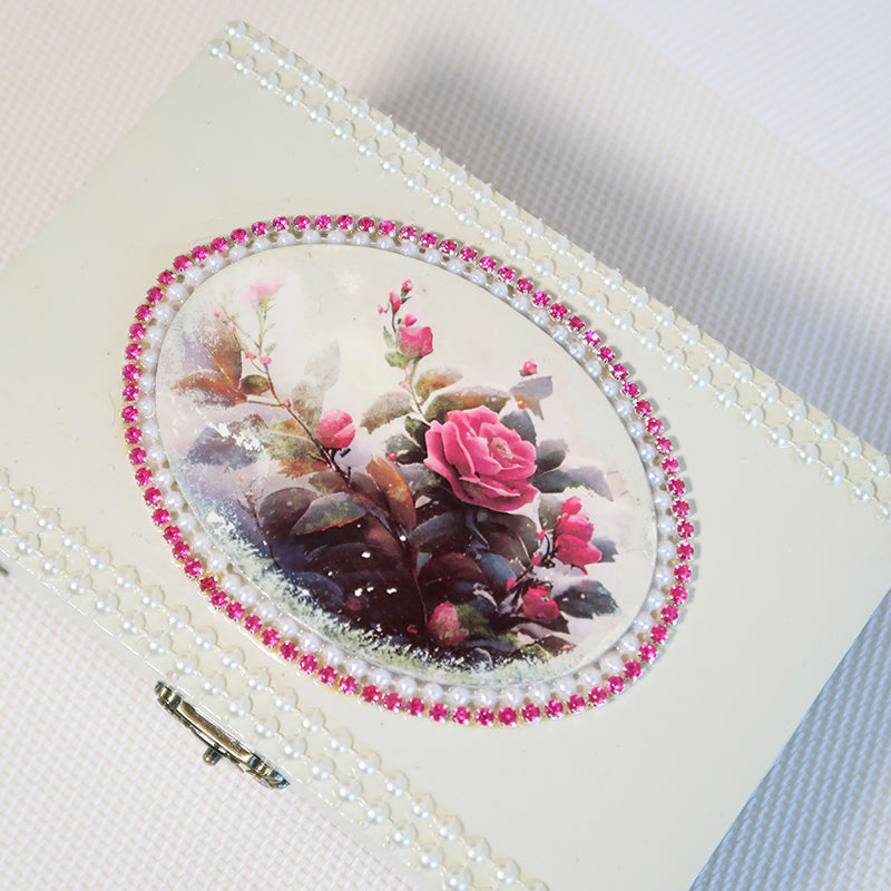 Elegantiška rankų darbo balta dėžutė dekoruota subtiliais gėlių motyvais, perlų imitacijos karoliukais ir rožinės spalvos spindinčiomis akutėmis.