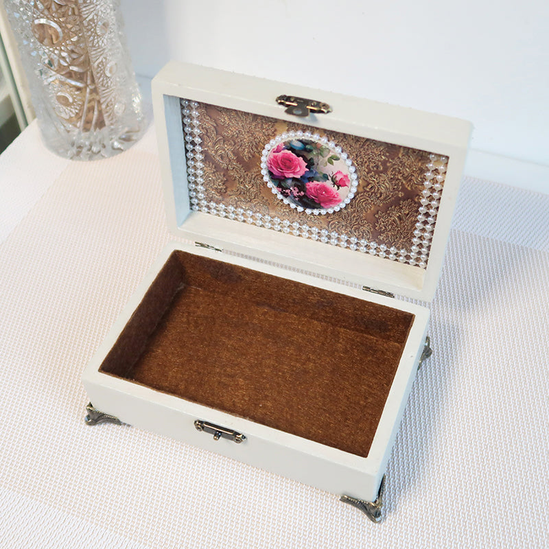 Ši puošni vintažinė dėžutė puikiai tinka papuošalams, smulkmenėlėms ar ypatingiems prisiminimams laikyti. Dėžutė padengta aukščiausios kokybės laku, todėl yra lengvai prižiūrima ir ilgaamžė.