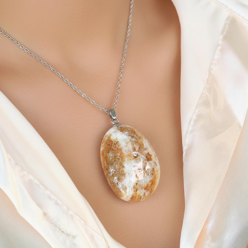 Pakabukas papildytas sidabro spalvos nerūdijančio plieno grandinėle – elegantiška, tvirta ir ilgaamže, puikiai derančia prie natūralios akmens spalvų gamtos.