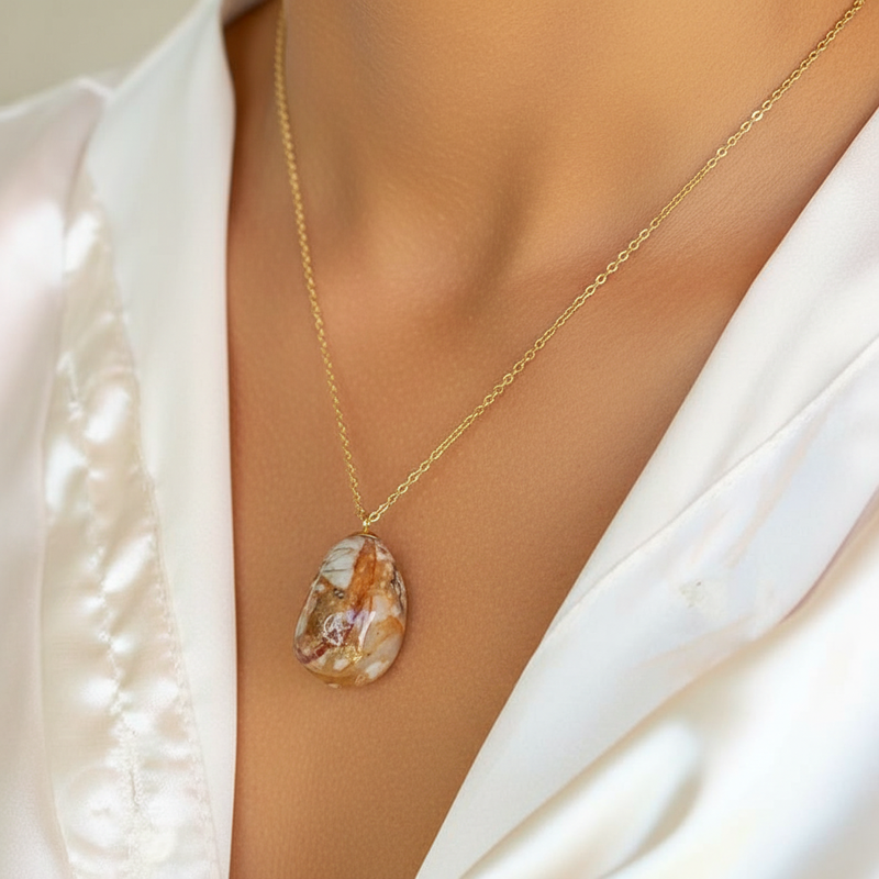 Šis autorinis rankų darbo kūrinys, puoštas paauksuota nerūdijančio plieno grandinėle, spinduliuoja elegancija ir unikalumu. „RUDRA“ – tai daugiau nei papuošalas: tai tylus šauksmas iš žemės gelmių, kviečiantis nešioti vidinę stiprybę ir ramybę kiekvieną dieną.