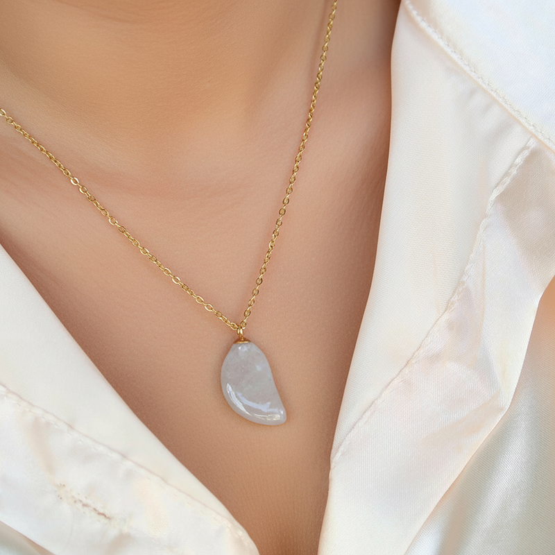 Pakabukas padengtas plonu juvelyriniu dervos sluoksniu, kuris išryškina natūralų akmens grožį bei apsaugo nuo įbrėžimų ir dėvėjimosi. Prie šio pakabuko pridedama paauksuota nerūdijančio plieno grandinėlė.