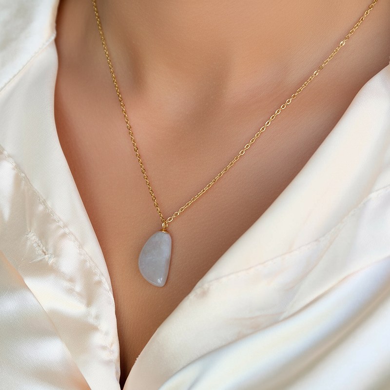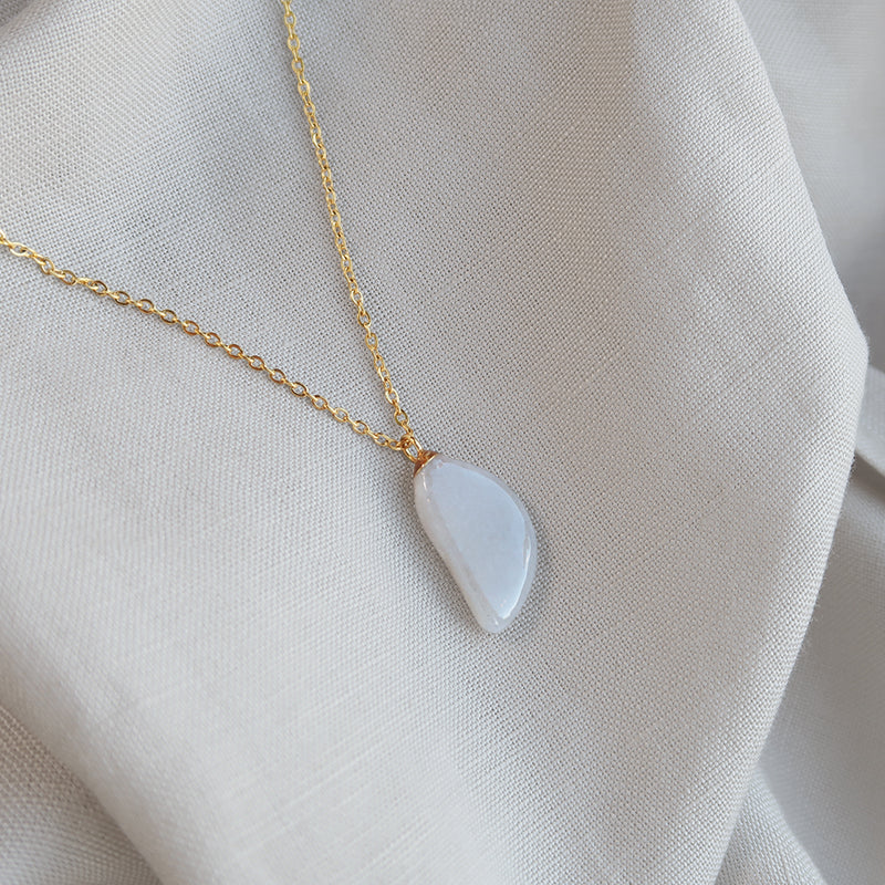 PUSMĖNULIS – autorinis rankų darbo pakabukas iš Baltijos jūros kvarco. Natūralus kvarco akmuo, nugludintas bangų, primena naktinį dangų ir pusmėnulio spindesį.