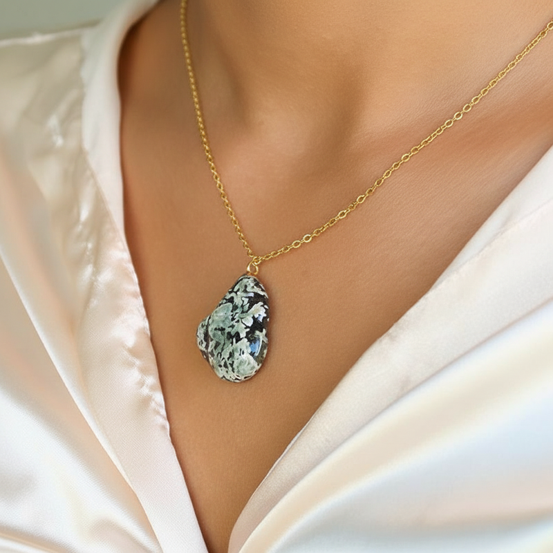 Papuošalas papildytas aukso spalvos nerūdijančio plieno grandinėle – elegantiška, subtiliai spindinti, ilgaamžė. Puikiai dera tiek kasdienai, tiek ypatingoms akimirkoms, kai norisi artumo su gamta ir savimi.