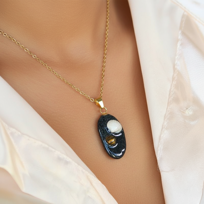 Šis rankų darbo papuošalas alsuoja subtilumu – jame susilieja jūros nuglūdinto akmens tvirtumas ir moteriškas jausmingumas. Prie pakabuko priderinta elegantiška paauksuoto nerūdijančio plieno grandinėlė. GILUMA – tai ne tik papuošalas, tai vidinio pasaulio ženklas: tylus, grakštus, jausmingas.