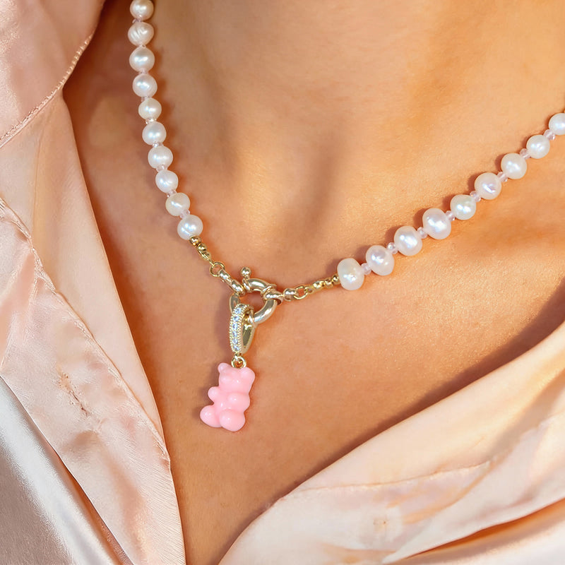 Vėrinys suvertas iš gėlavandenių perlųbei dekoruotas rožinės meškos pakabuku-talismanu. Vėrinys suvertas ant specialaus siūlo, todėl yra lankstus, gražiai priglunda ir žiūrisi.