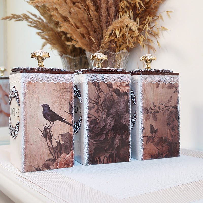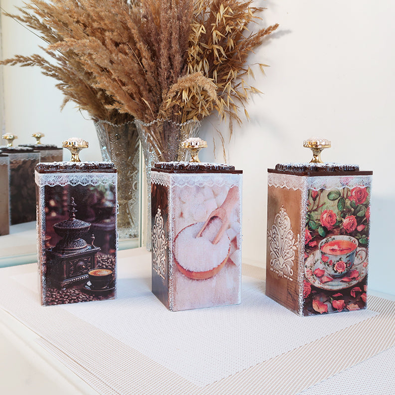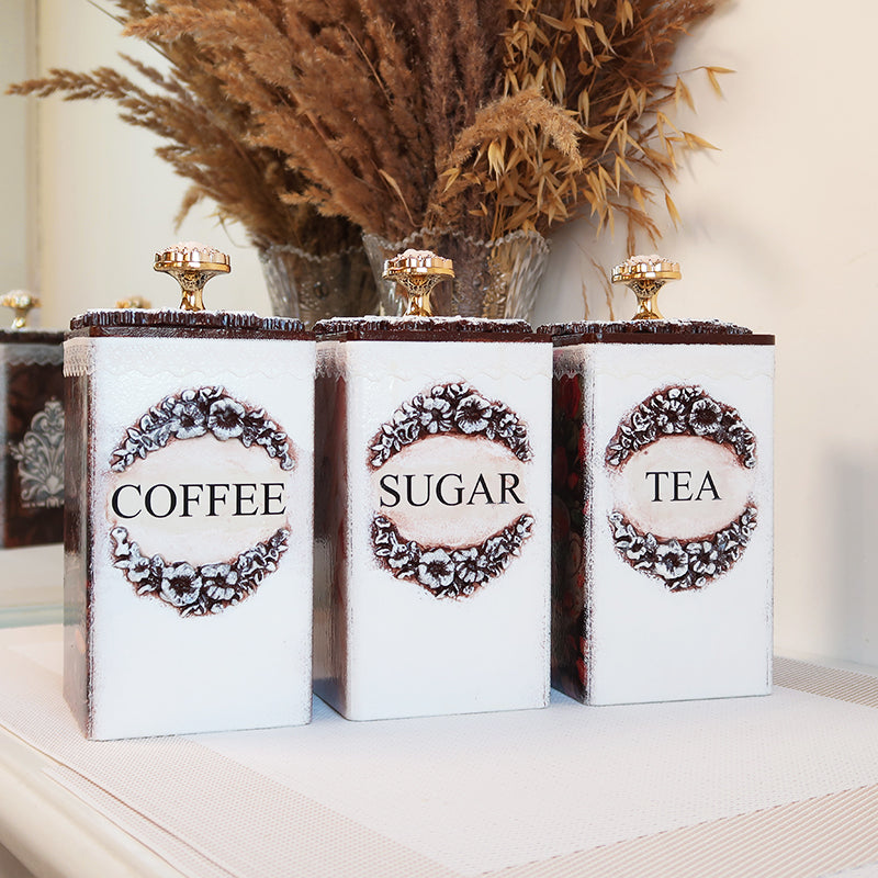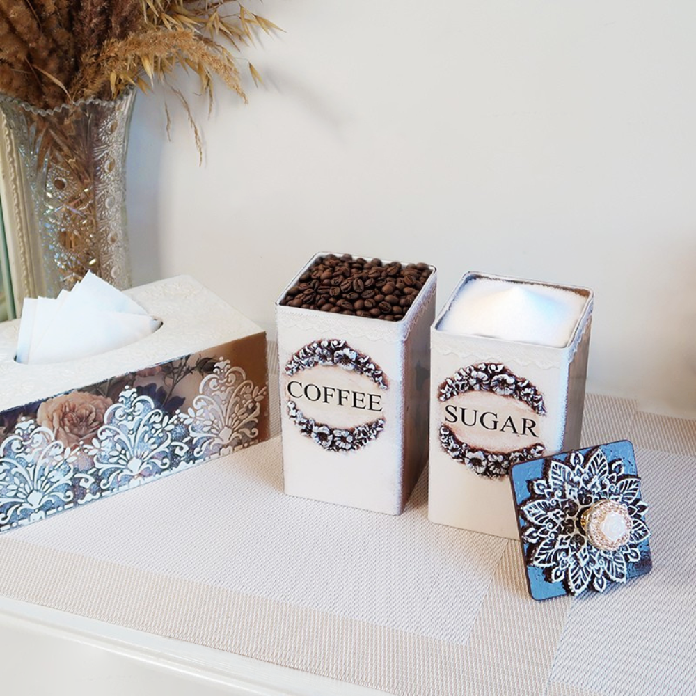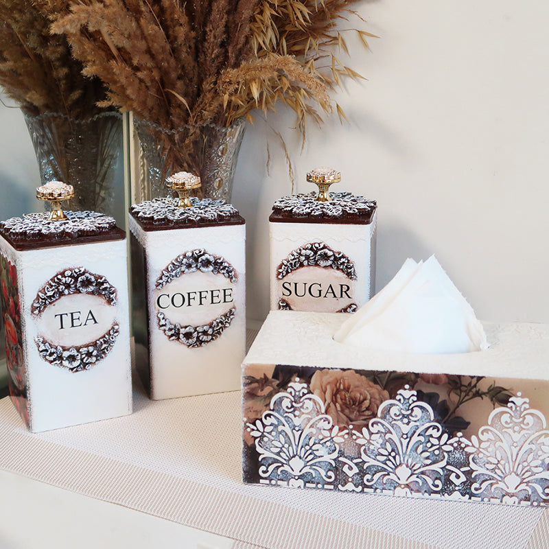 Prabangus rankų darbo indelių rinkinys kavai, arbatai ir cukrui su servetėlių dėžute.