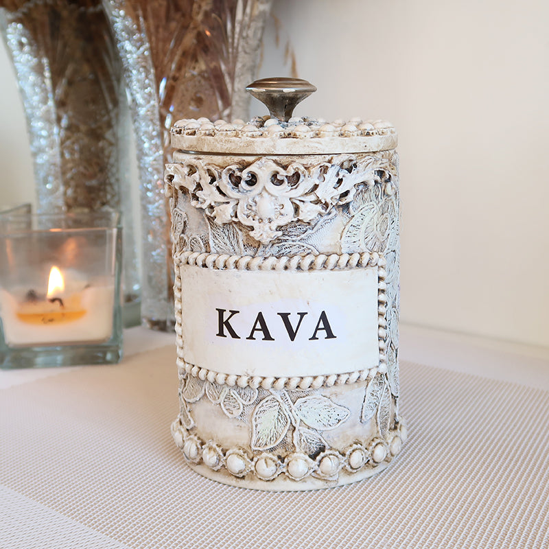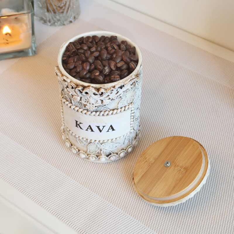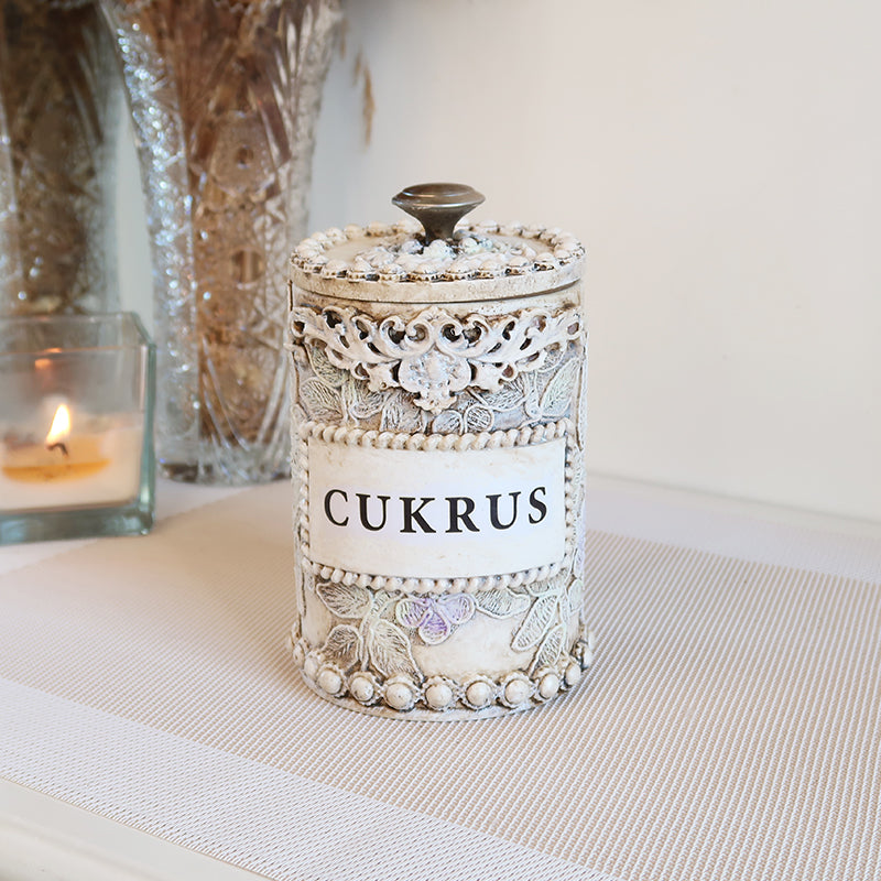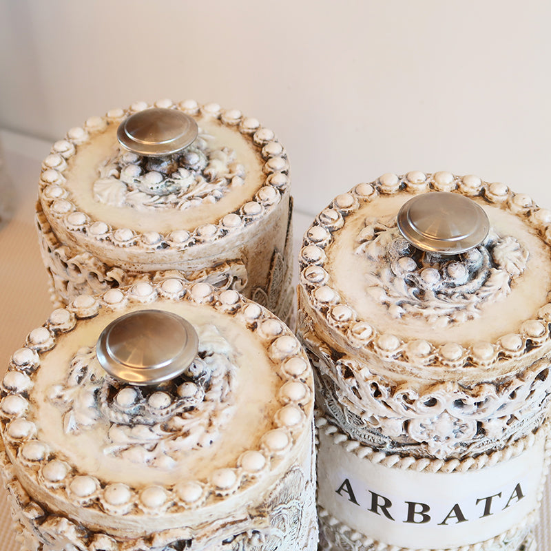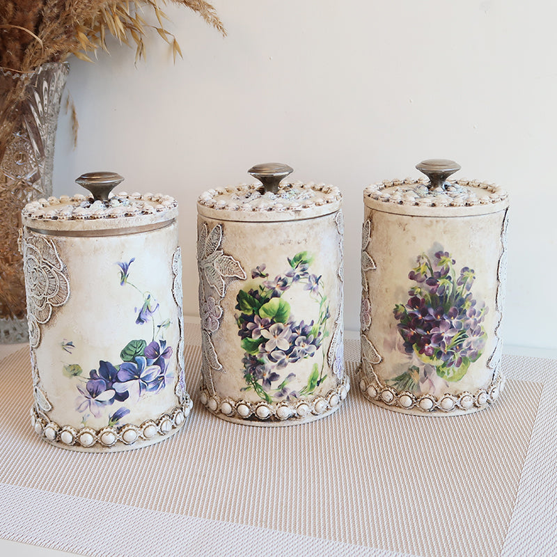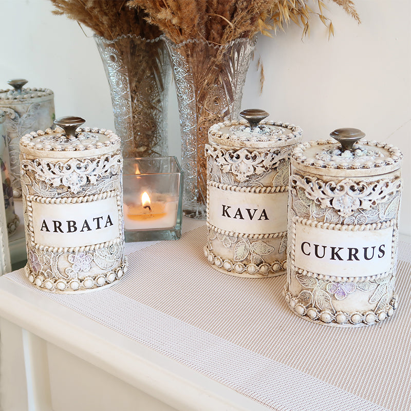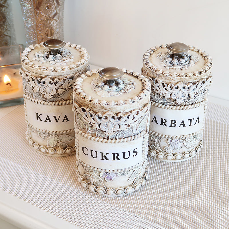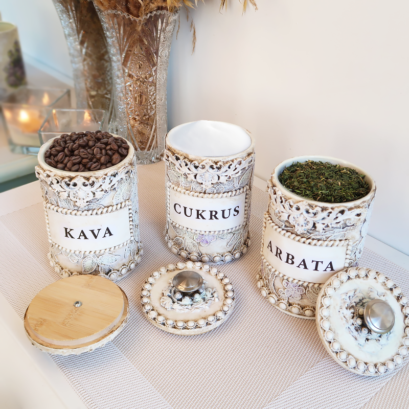 Šis unikalus rinkinys – tai trys subtiliai dekoruoti indeliai, skirti arbatai, kavai ir cukrui. Kiekvienas indelis dekoruotas rankomis, sendintas natūraliai, todėl kiekvienas jų turi savo individualią, unikalią išvaizdą. Ant jų paviršiaus puikuojasi gipiūriniai gėlių raštai, alyvų motyvai bei karališkos detalės, kurios suteikia šiam rinkiniui nepakartojamo žavesio ir autentiškumo.