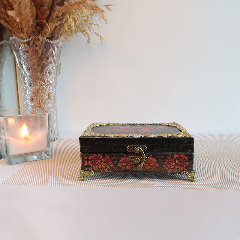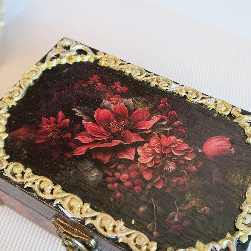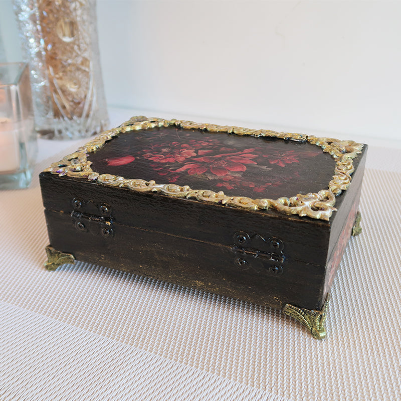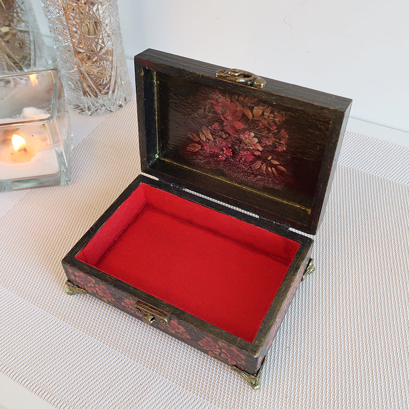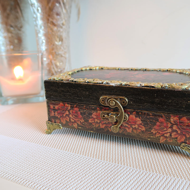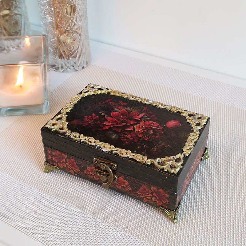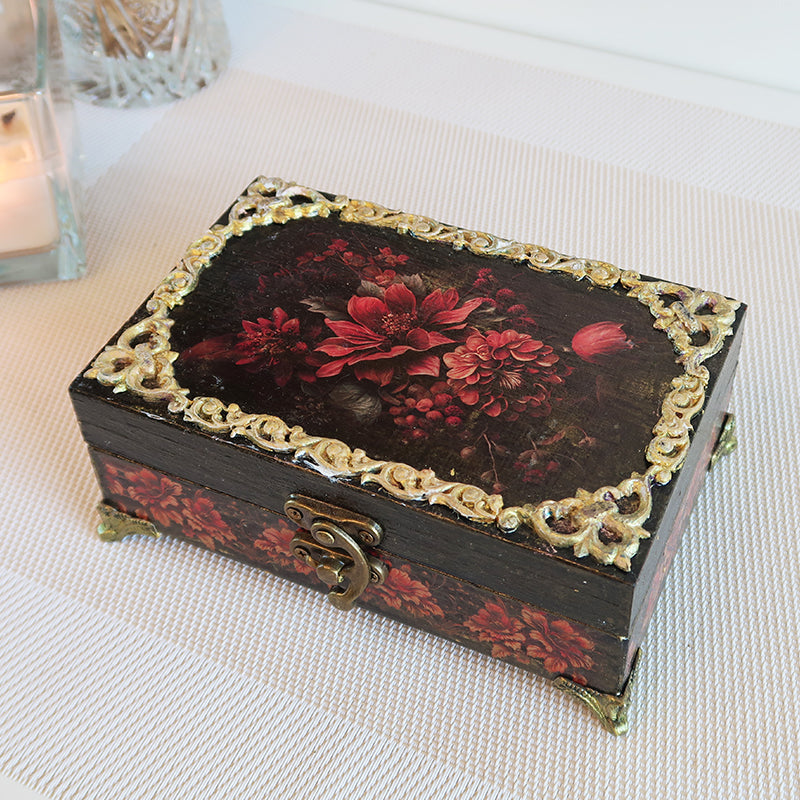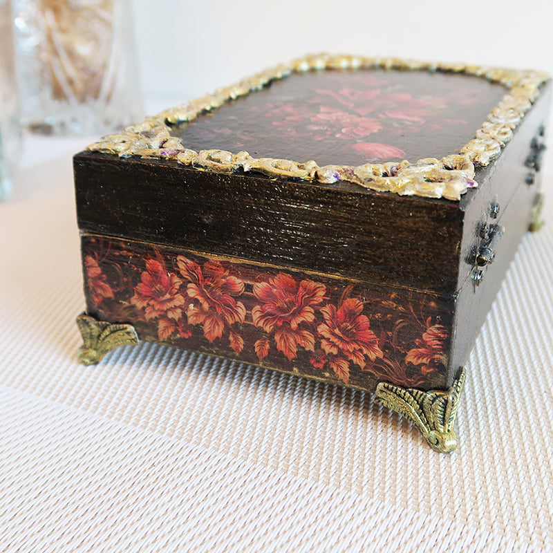 Prabangi rankų darbo vintažinė dėžutė, dekoruota raudonų gėlių motyvais ir karališkais aukso spalvos ornamentais, ne tik papuoš namus, bet ir taps išskirtine brangenybių saugykla.