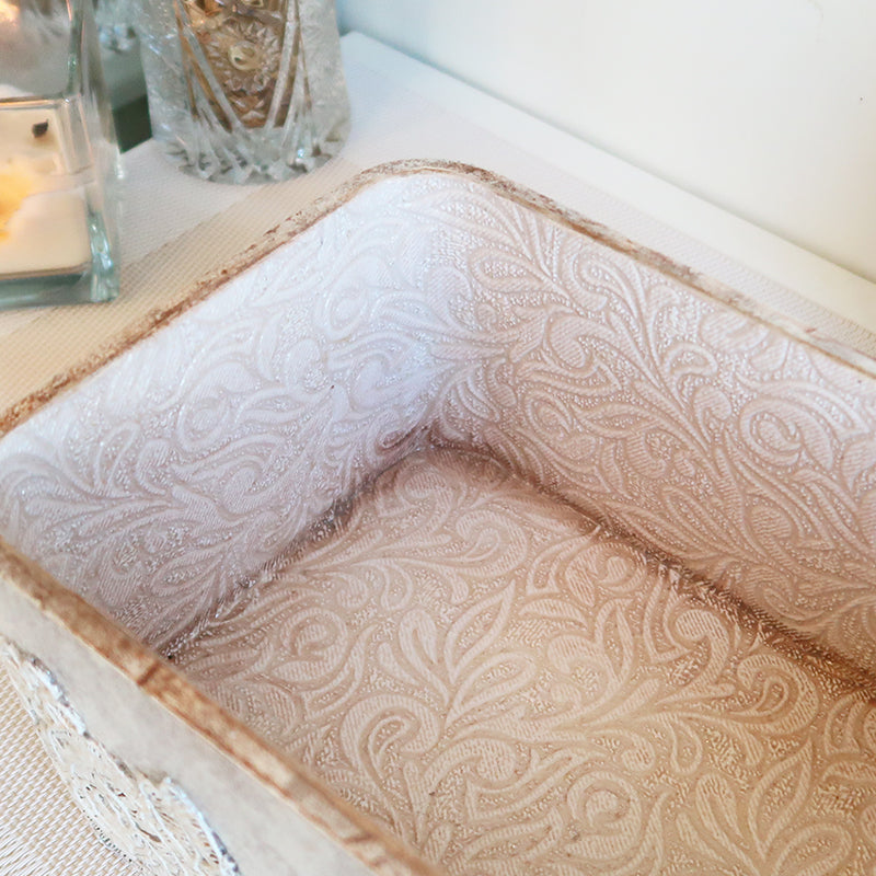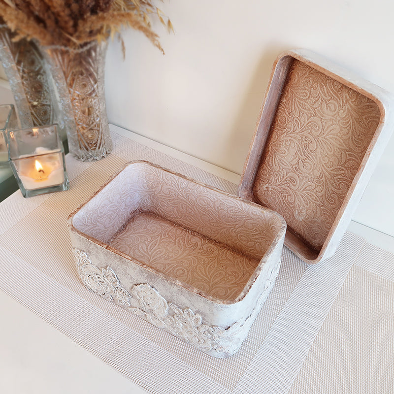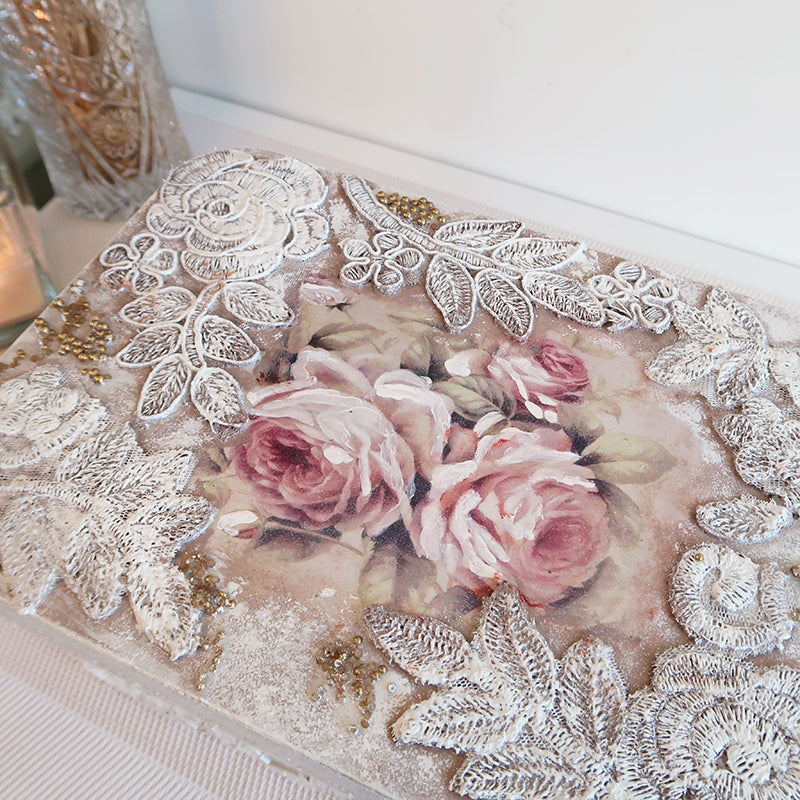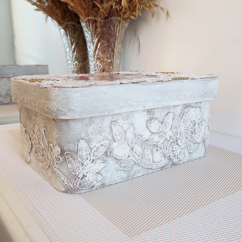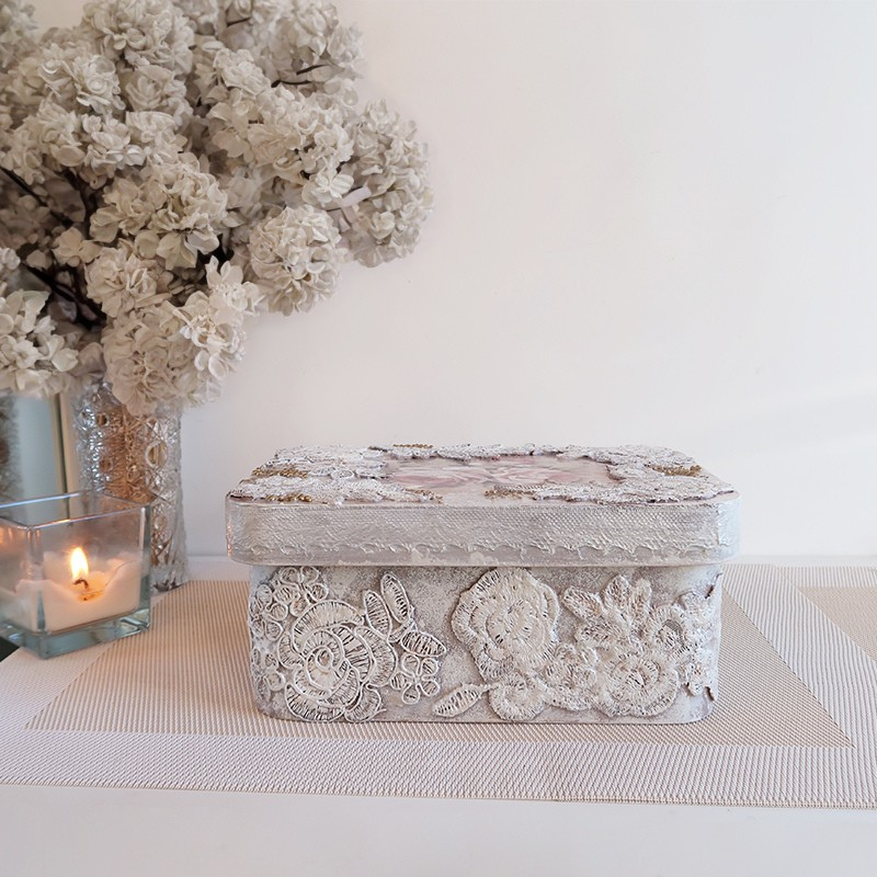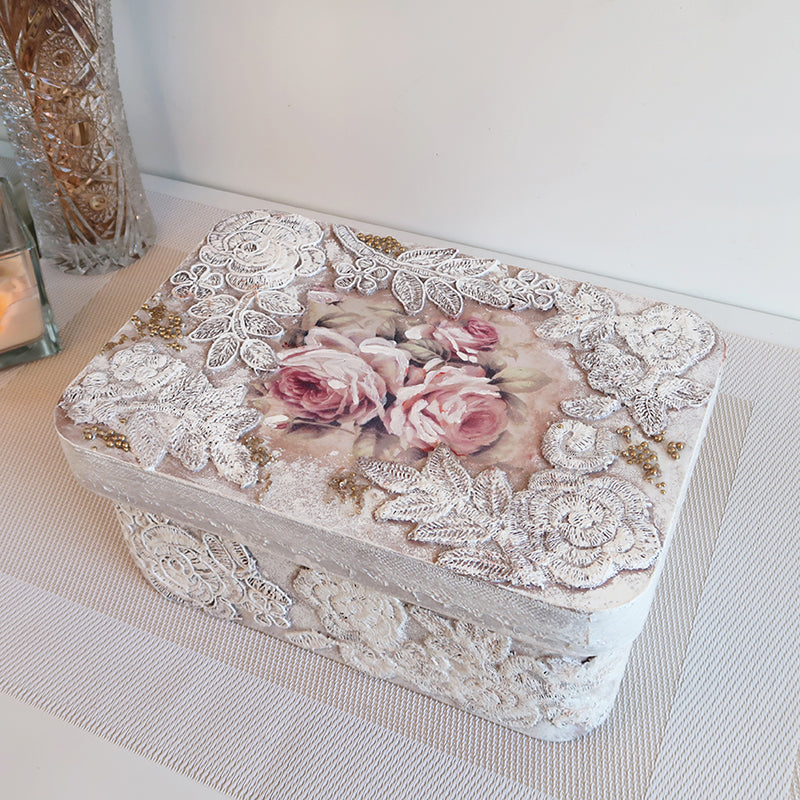 Puošni, baltos spalvos dviejų dalių medinė dėžutė su dangteliu, dekoruota subtiliais rožių motyvais, gipiūro rožėmis ir lapeliais. Dėžutė pagyvinta karališkais aukso spalvos karoliukais bei prabangiais baltais ornamentais ir detalėmis. Vidus puoštas kreminės spalvos raštais, kurie suteikia švelnumo ir elegancijos pojūtį.