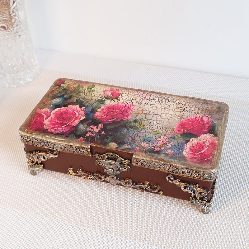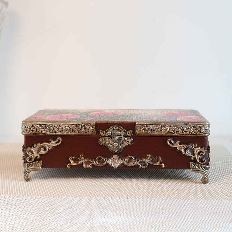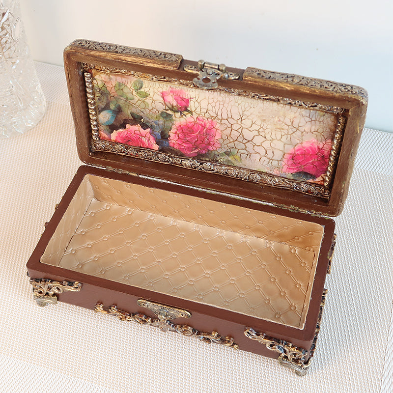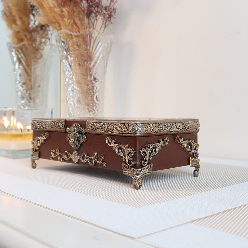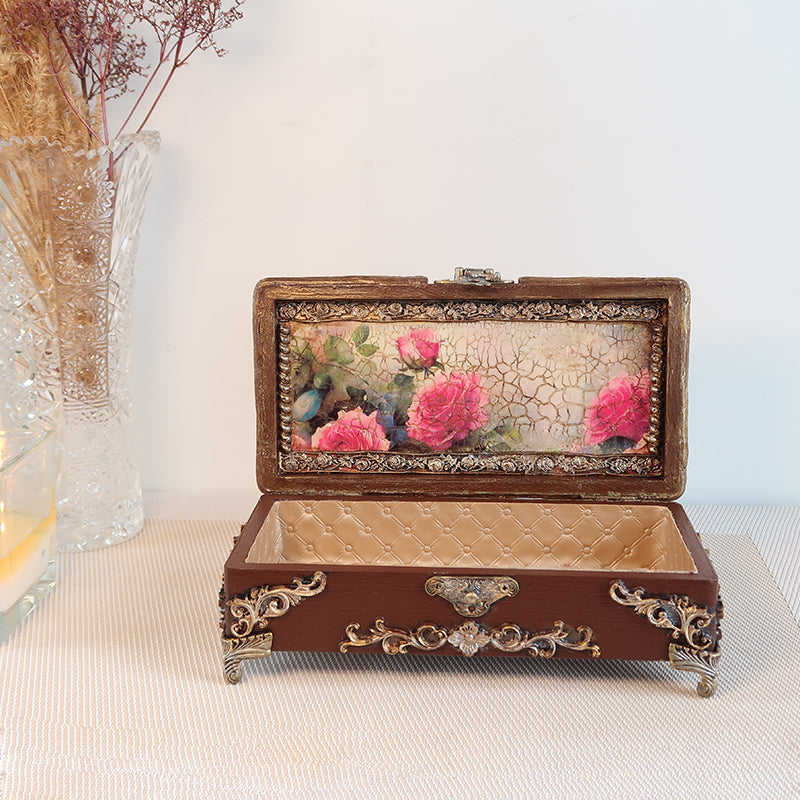 Puošni rankų darbo vintažinė dėžutė dekoruota karališkais rožių motyvais ir sendinto aukso ornamentais. Dėžutė išsiskiria sodria riešuto ruda spalva, kuri harmoningai dera su subtiliai sendintais aukso atspalviais.
