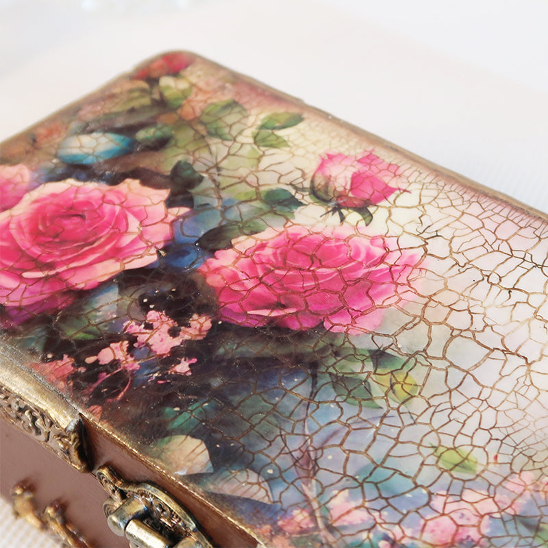 Dėžutės dangtelis dekoruotas romantiškomis rožėmis bei subtiliais ornamentais. Vidinėje dangtelio pusėje puikuojasi dar daugiau rožių auksiniame rėmelyje. Dėžutės vidus išklijuotas kreminės spalvos eko oda.