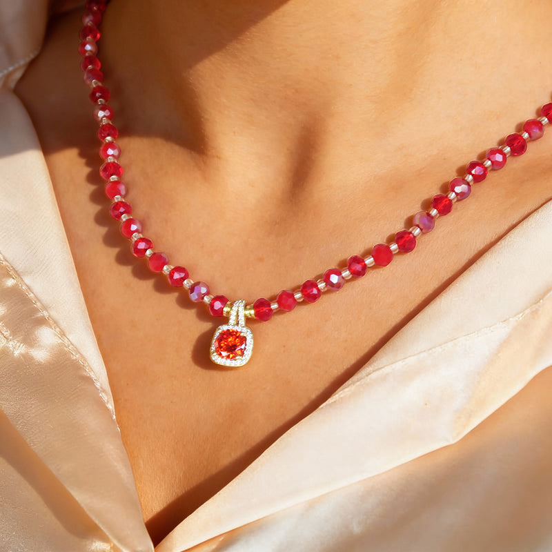 Romantiško dizaino rankų darbo vėrinys suvertas iš AAA klasės raudono Austriško stiklo karoliukų bei dekoruotas aukso spalvos pakabuku su raudono cirkonio akute. Cirkonis nuostabiai spindi ir savo žėrėjimu primena tikrus deimantus.