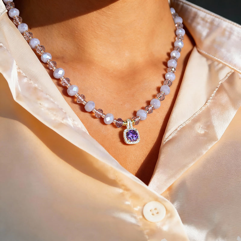 Kerinčio dizaino rankų darbo vėrinys suvertas iš AAA klasės violetinio Austriško stiklo karoliukų bei dekoruotas aukso spalvos pakabuku su violetine cirkonio akute. Cirkonis nuostabiai spindi ir savo žėrėjimu primena tikrus deimantus.