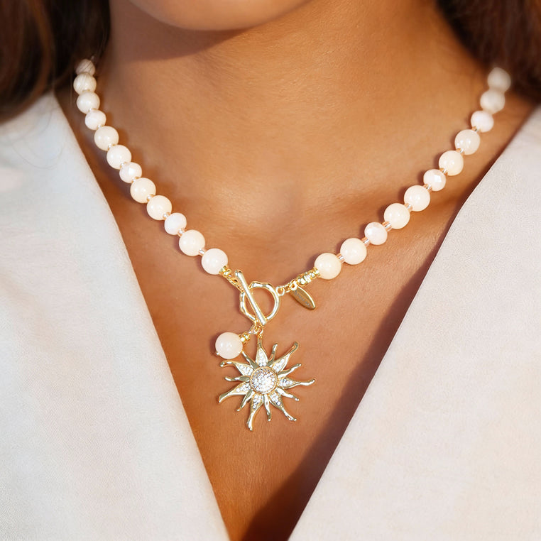 Puošnus rankų darbo vėrinys suvertas iš natūralių žadeito karoliukų bei dekoruotas  spindinčiais AAA klasės Austriško stiklo karoliukais. Vėrinį puošia saulės simbolis su, nuostabiai spindinčiais, cirkoniais. Vėrinys suvertas ant specialaus siūlo, tad nuostabiai priglunda ir žiūrisi.