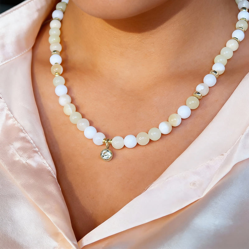 Puošnus rankų darbo vėrinys suvertas iš natūralių baltojo ir saulės gelsvojo žadeito karoliukų bei dekoruotas spindinčiu šampaninės spalvos cirkonio pakabuku. Vėrinys suvertas ant specialaus siūlo, tad nuostabiai priglunda ir žiūrisi.