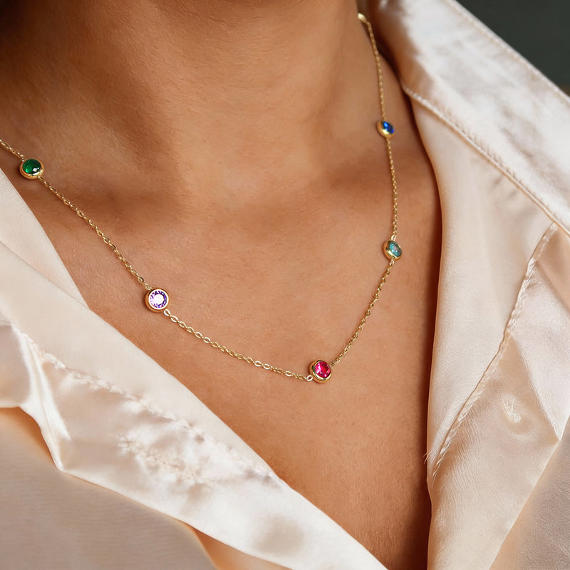 Stilingas, paauksuotas nerūdijančio plieno kaklo papuošalas dekoruotas spalvotais, spindinčiais cirkoniais. Cirkonio akmenukai nuostabiai spindi šviesoje ir, savo nuostabiu žėrėjimu, primena tikrus deimantus.